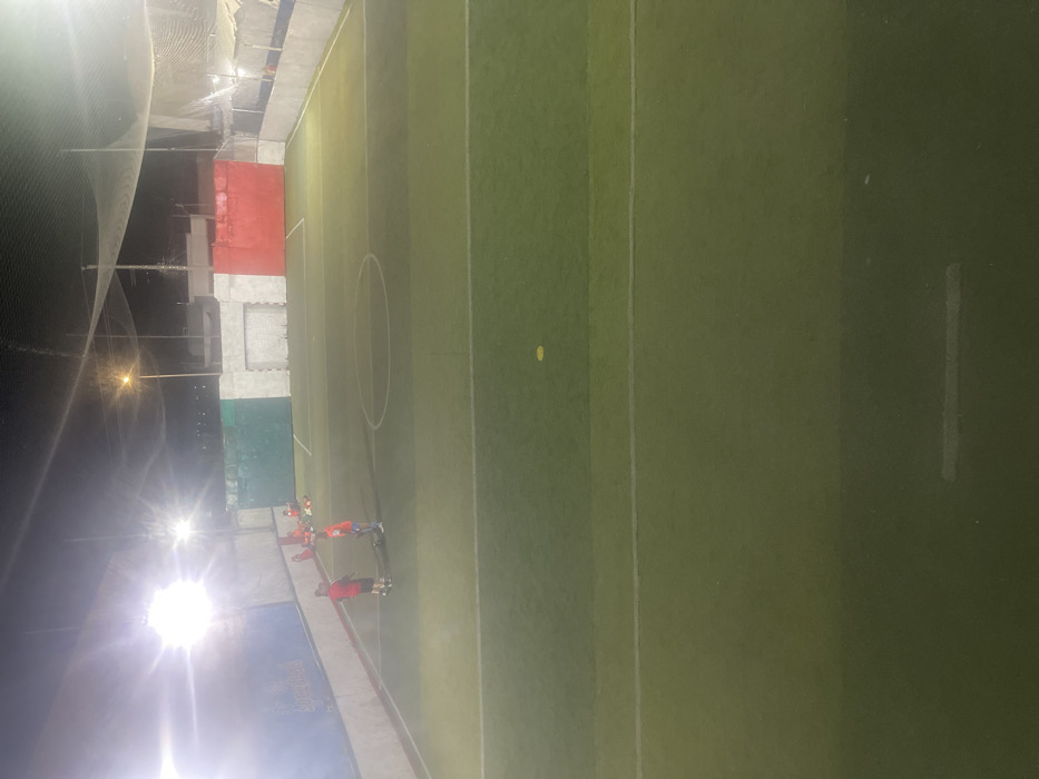 A brightly lit soccer field at night with a central circle. People in red and orange uniforms stand on the sidelines near one end. The field is lined with white markings. The background includes walls, netting, and lights casting a glare.