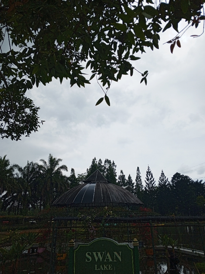 The scene captures Swan Lake under a cloudy sky, partly obscured by tree branches. A dark, domed structure with a conical top stands prominently, surrounded by dense greenery including palms and evergreens. In the foreground, a sign bearing "Swan Lake" is visible, framed by a wrought-iron fence or railing that borders the water's edge. The overall mood is somewhat muted, reflecting the overcast weather.