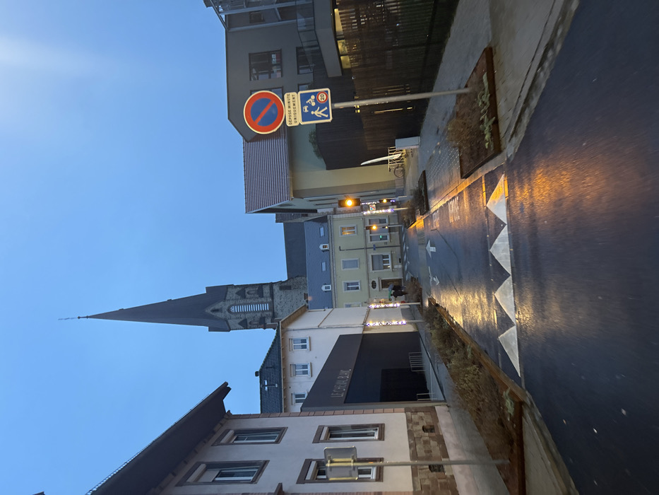 An urban scene depicts a street lined with buildings and a church steeple rising against a blue sky. A road with reflective surfaces is marked with white triangles. Street signs indicate parking restrictions and a shared path for pedestrians and cyclists with a speed limit of 20 km/h. The lighting suggests either early morning or late evening.