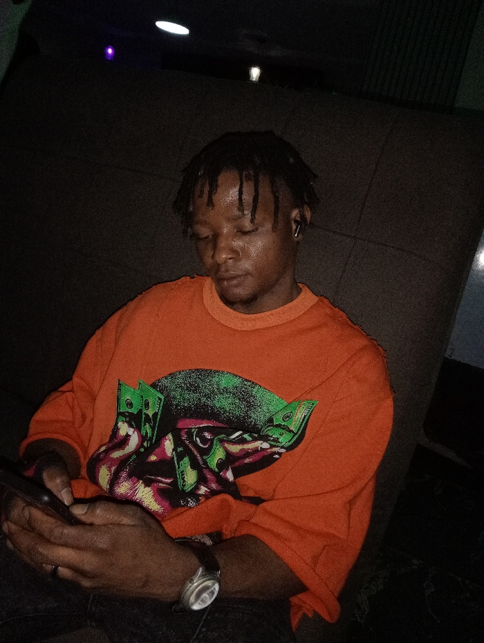 A man with dreadlocks sits indoors, bathed in dim light. He wears a bright orange, graphic-print t-shirt and a watch on his left wrist. He holds a cell phone, his gaze focused downwards. A wireless earbud is visible in his left ear. He appears relaxed against a dark, cushioned surface, likely a couch or chair. A light source is visible in the background.