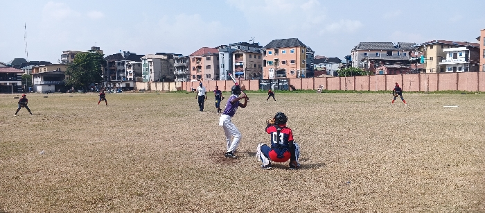 An outdoor baseball game is in progress on a dry, yellowish-brown grass field in an urban area of Lagos, Nigeria