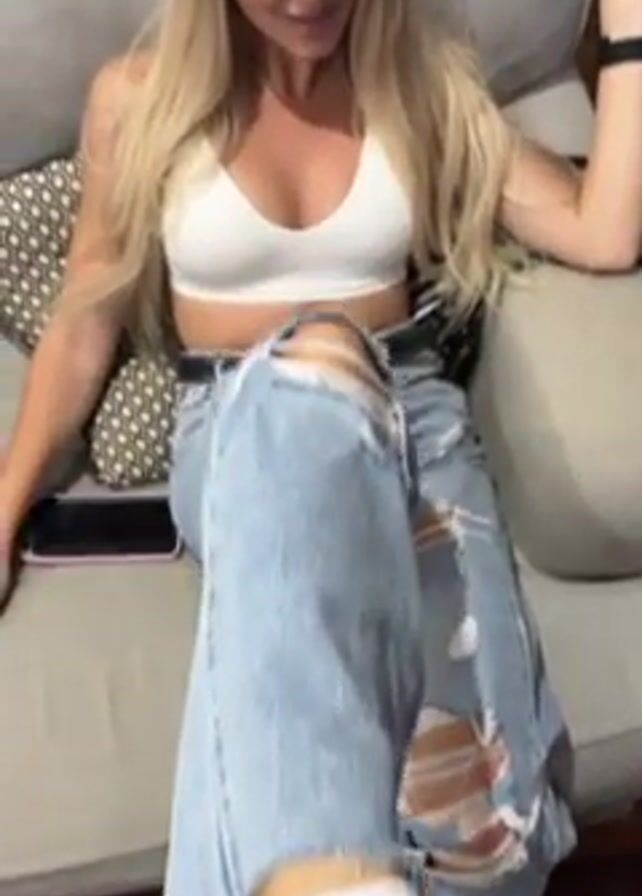 A fair-skinned woman with long blonde hair, wearing a white top and heavily ripped blue jeans, is seated on a gray couch