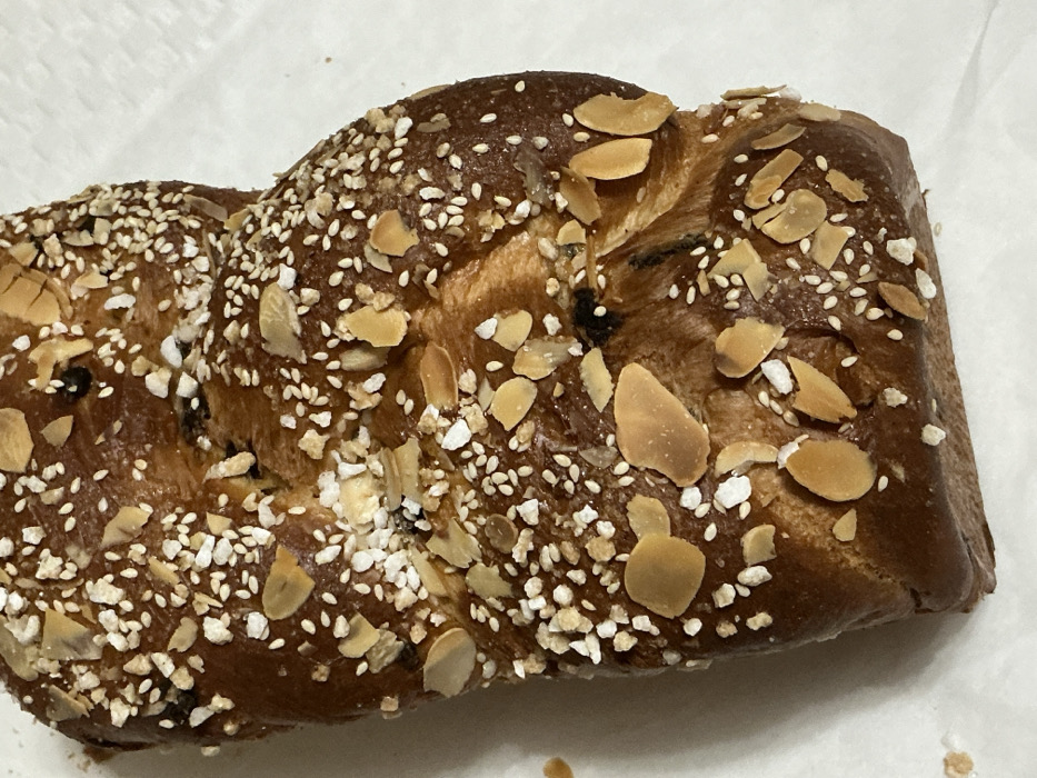 - "A close-up view depicts an elongated, braided sweet bread loaf, positioned on a plain white, unpatterned surface" by FM-Vbb4u1, licensed under CC BY 4.0