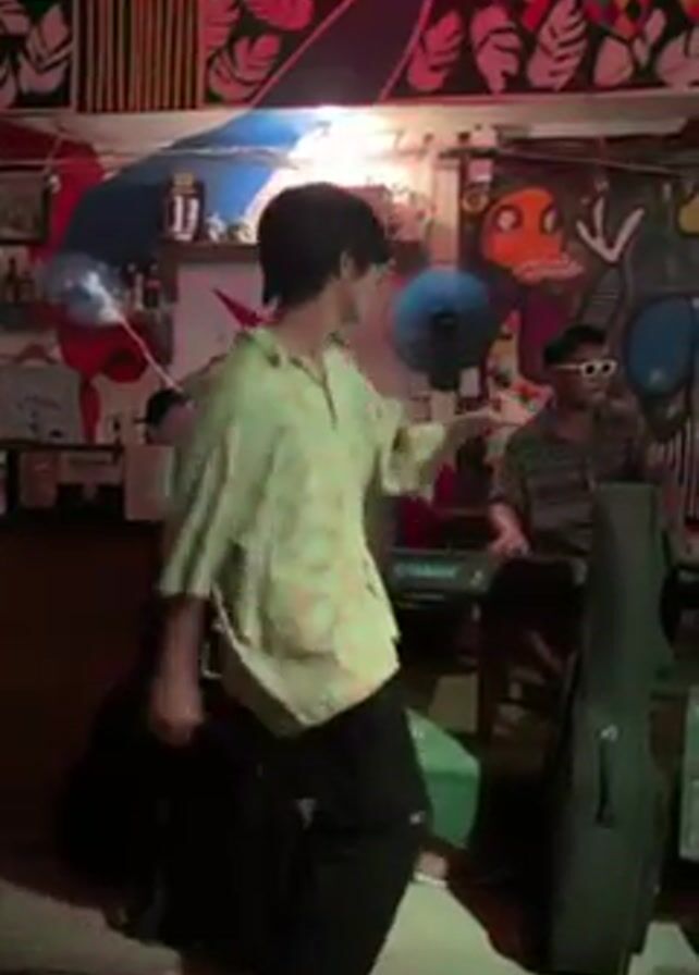A medium shot shows two men performing music in a room with walls covered in graffiti. The man on the left, who appears to be the singer, wears a loose-fitting yellow shirt with a floral print, black wide-legged pants, and black shoes. He's moving around, dancing and singing along with the music. To his right, another man wearing a grey patterned shirt and white sunglasses is seated at a Yamaha keyboard, playing along. A small blue fan is placed behind him. Guitar cases are leaning against the walls on either side of the keyboardist. The room is lit with red and blue lights, and there is a bar area visible in the background filled with bottles. The graffiti on the walls features various images and abstract designs.