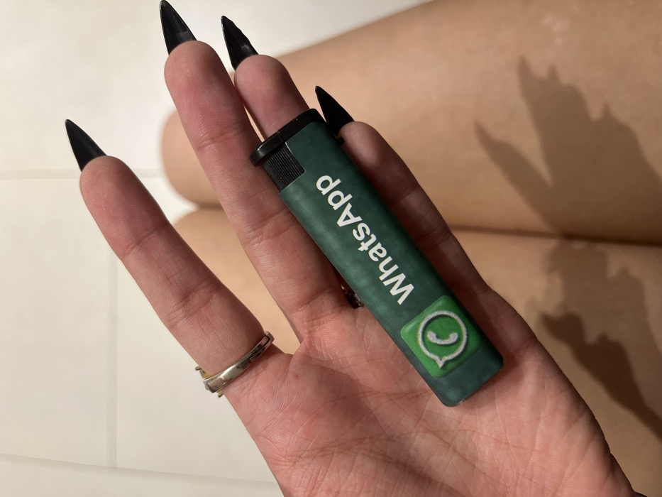 A fair-skinned hand with long, black, stiletto-shaped nails holds a green lighter with the WhatsApp logo and name printed on it