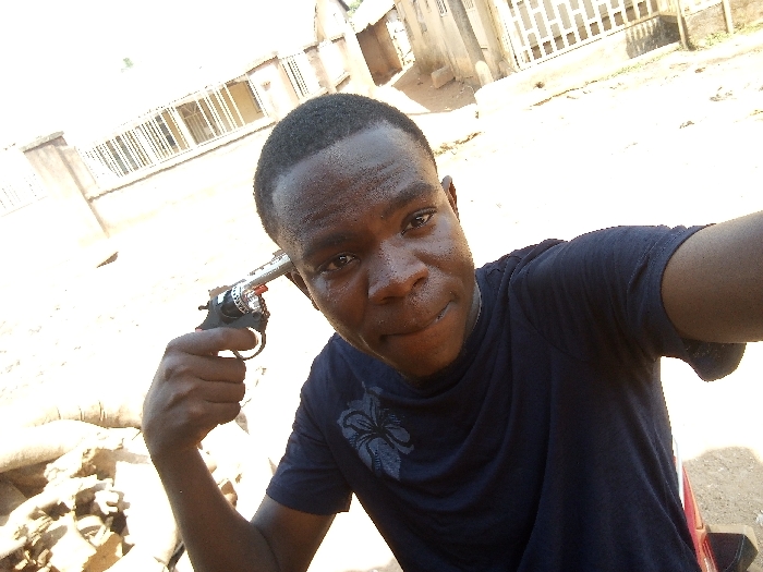 This image depicts a young male, appearing to be of African descent and in his late teens or early twenties, positioned in the foreground. He is looking directly at the camera with a slight smirk, holding a revolver against his right temple. The male wears a dark short-sleeved t-shirt with a faded graphic design on the left chest. The firearm, identified as a revolver, features a black grip and a metallic-colored barrel and cylinder, with a distinct red element visible on the cylinder mechanism. The scene is outdoors, brightly lit by direct sunlight, creating strong shadows. The ground beneath is unpaved and appears dusty. To the lower left, several light-colored sacks or bundles are stacked. The mid-ground shows a light-colored building or boundary wall topped with a white, horizontal security grille. Additional residential-style buildings are visible in the background. This scene is situated in the city of Akwanga, Nigeria.