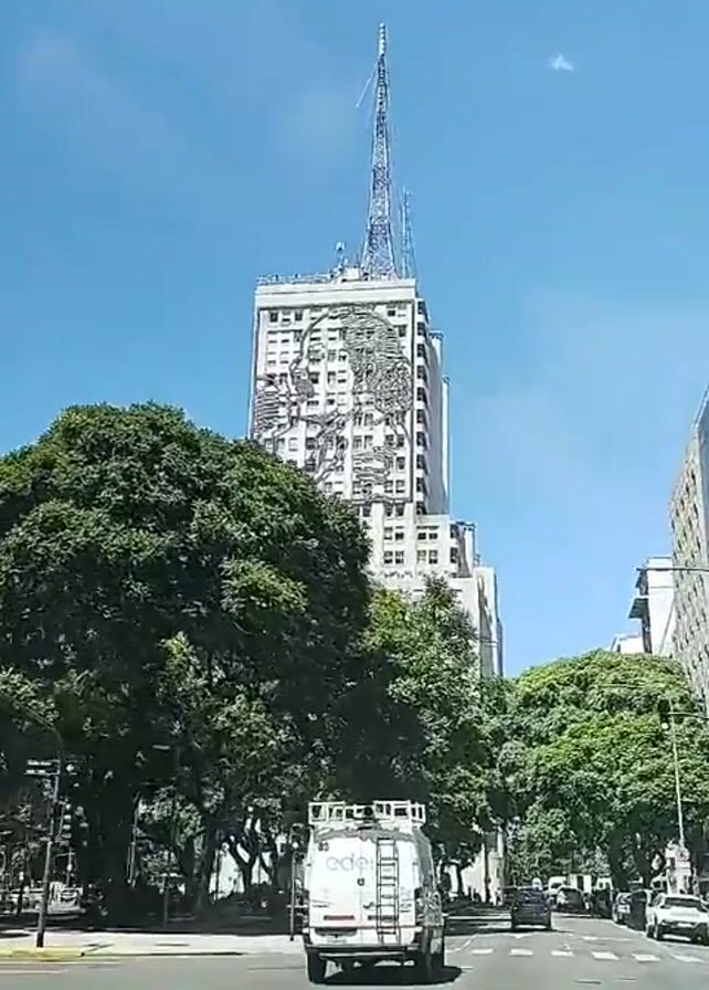 A vehicle appears to be driving toward the front of a tall, white building on a clear, sunny day. The building has a very tall tower on top, and a large portrait of a person on its facade. Large trees frame the building. A white van labeled "Edenor" is in the foreground. A crosswalk is visible on the street in front of the van. Other cars are present on the road.