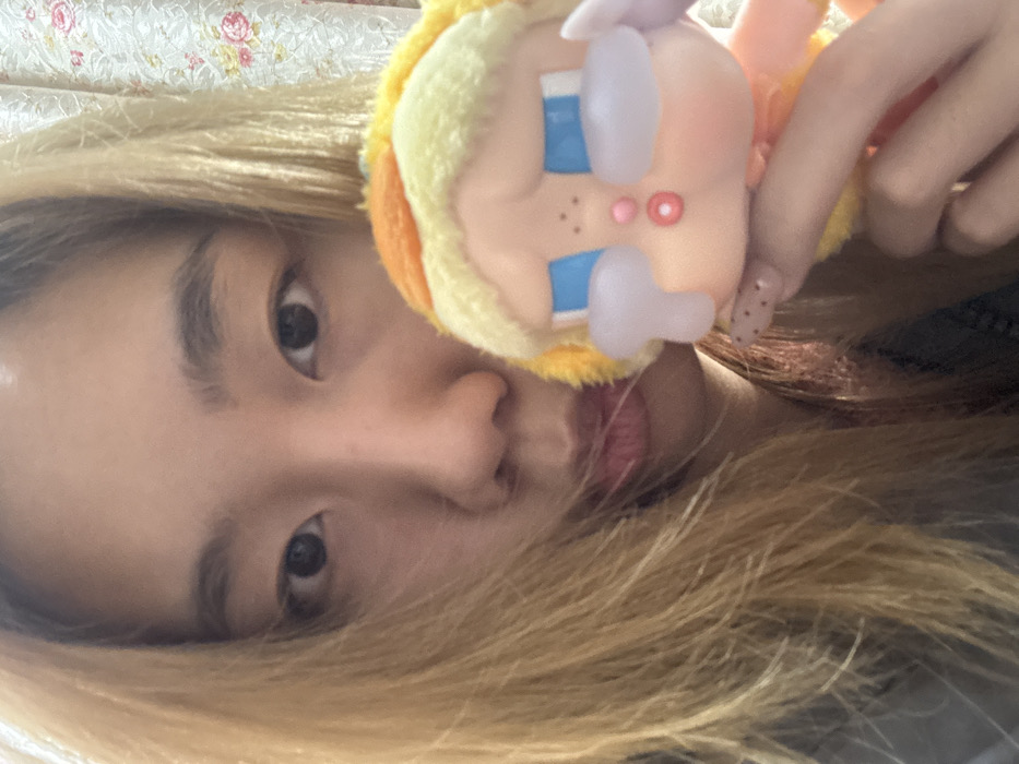 The scene is located indoors in Shapingba District, China, and features a close-up, eye-level shot of an East Asian female. Her long, light blonde hair is partially draped across the left side of her face. She has dark eyes, a visible nose, and her lips are slightly parted. The subject wears a dark-colored garment, visible on the lower left. Her right hand, featuring light-colored fingernail polish with small dark polka dots, holds a stylized toy. The toy has a peach-toned face with prominent blue rectangular eyes, small pink circular cheeks, a red mouth, and two translucent white teardrop-shaped elements beneath the eyes. It is topped with orange and yellow plush material. The toy is positioned in the foreground, partially obscuring the lower right aspect of the individual's face. The background consists of a light-colored curtain patterned with pink flowers and green leaves.