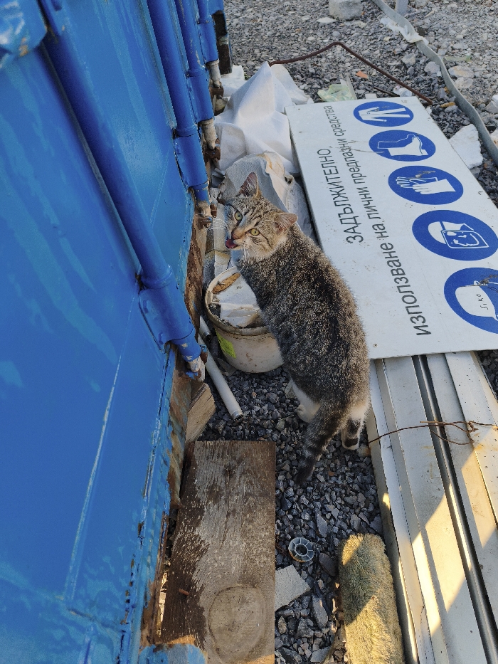 A tabby cat stands beside a blue metal structure, its tongue slightly out. The cat is next to a white bucket. A sign with safety icons is lying on the ground. Other objects such as wood and metal are scattered around the area. The ground is covered with gravel. The lighting suggests it's daytime.