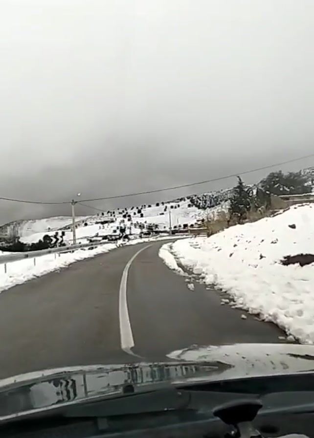 car driving on a paved road in a snowy, mountainous area. The road has a solid white line down the center, and the shoulders are covered in snow. There are trees and buildings visible in the distance, also covered in snow. The sky is overcast and gray. The view is from inside the car, looking out the windshield.