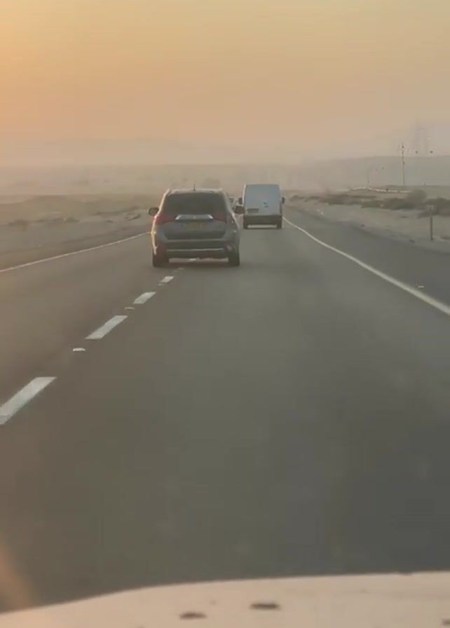 A vehicle is driving down an asphalt highway, and we are inside the vehicle. The road is straight and flat, flanked by a desert landscape with haze and a pale sky above. There is another SUV in front of us and a white van ahead. The footage is taken from the viewpoint of the driver.