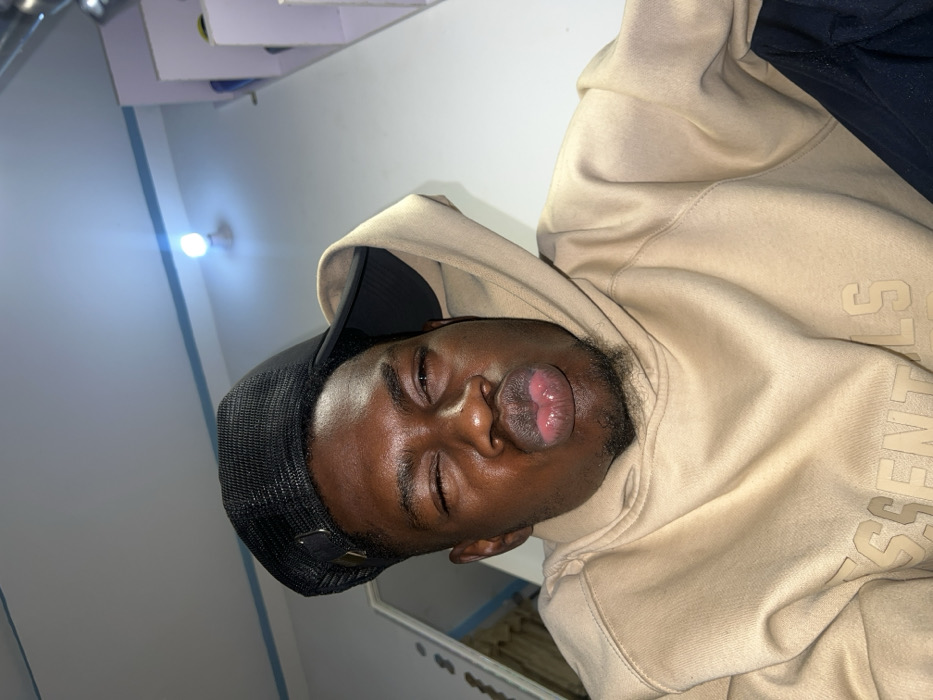 A dark-skinned person wearing a beige hoodie with "ESSENTIALS" embossed on the right sleeve is angled towards the right. He's wearing a black trucker hat with a metallic buckle and has slightly parted lips. The background is a neutral white/gray wall with a visible light fixture. A glimpse of what appears to be a window or mirror frame is visible at the bottom left. The image is oriented horizontally, with the subject leaning towards the left side.