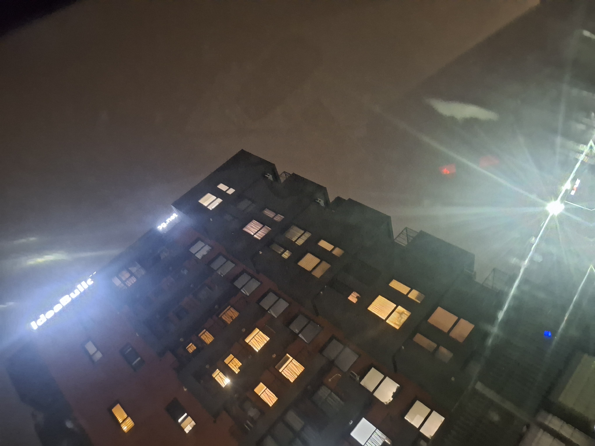 The image depicts a nighttime upward view of the IdeaBuild Complex located at Tsarigradsko shose Blvd 70, 7th-11th Kilometer, Sofia, Bulgaria. A multi-story modern building dominates the frame, showcasing a facade composed of contrasting reddish-brown and dark grey sections. Numerous rectangular windows are visible across its elevation, with many illuminated by warm yellow-orange light and some by white light, indicating internal occupancy. Illuminated white signage displaying "IdeaBuild" and a partial "PG.net" is visible on the upper portion of the building. The sky above is dark and indistinct, suggesting heavy cloud cover or fog, which contributes to a diffused glow around the lights. A powerful ground-level light source in the bottom-center of the frame creates a significant starburst lens flare, partially obscuring the lower architecture. Another darker, less distinct building is partially visible on the far right. No individuals or explicit actions are discernible.