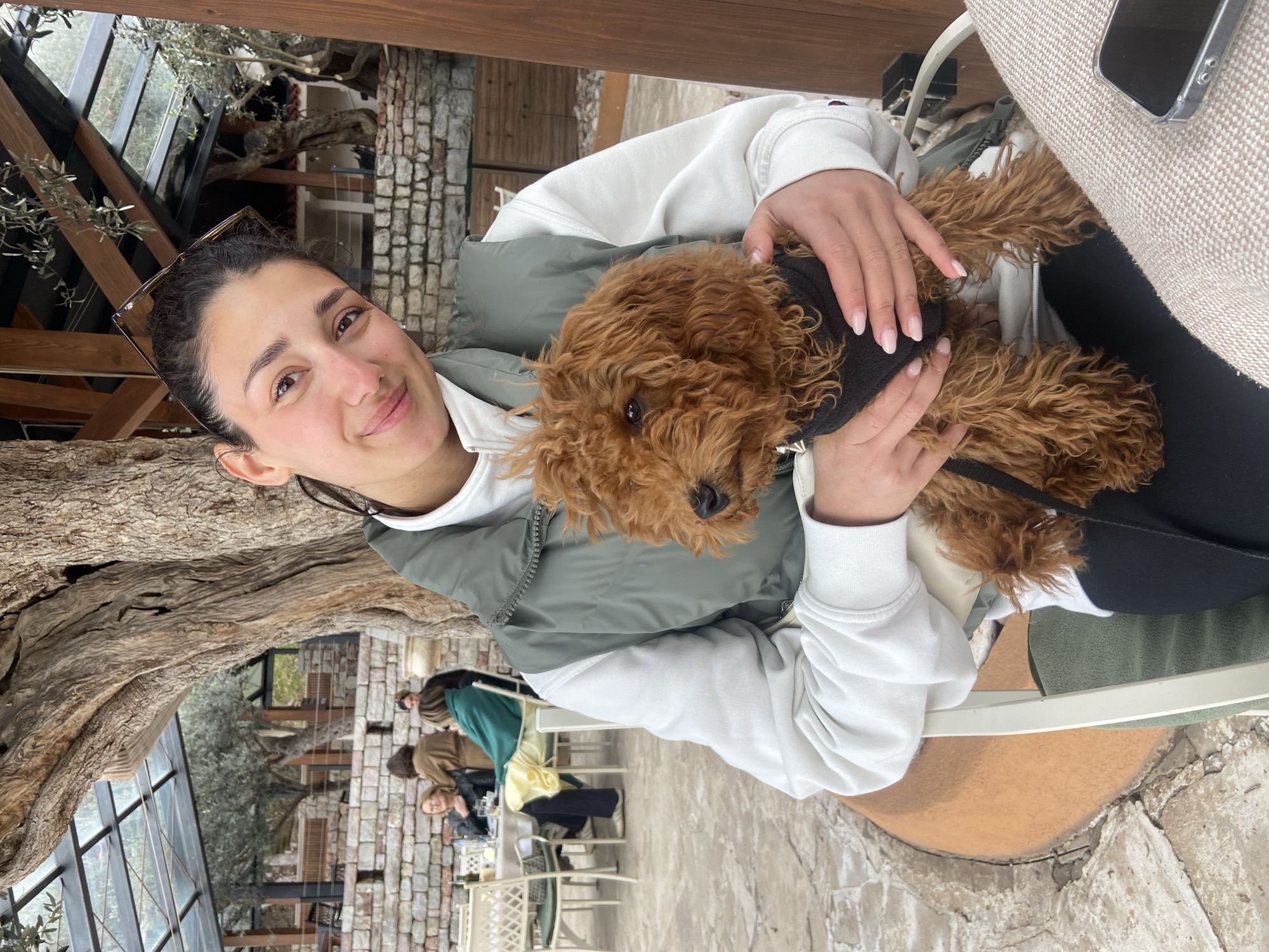 A woman with sunglasses on her head is seated at a table, holding a brown curly-haired dog with a black harness. She is wearing a white sweatshirt and a green vest. A cell phone is lying on the table to her right. Behind her, other patrons are seated at tables, and there is a view of an enclosed outdoor space with trees and brick walls, possibly in Sveti Stefan, Montenegro.