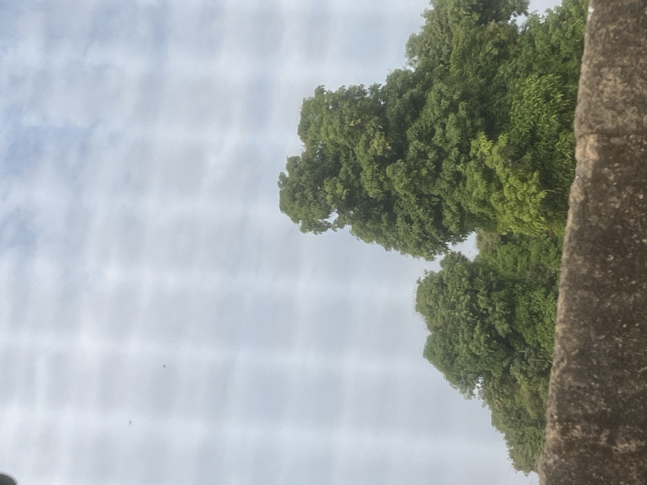 The image depicts a static outdoor scene in Bukuru, Nigeria, captured from an elevated perspective behind a weathered, dark gray-brown concrete or stone wall. This wall occupies the bottom approximately 15% of the frame and displays an uneven top edge with some surface texture. Above the wall, a dense line of lush green trees extends horizontally across the middle ground, with varying heights and foliage density. The tallest tree, with darker green leaves, is situated towards the right side of the frame, partially obscured by the foreground wall. The upper two-thirds of the image are dominated by a cloudy sky, characterized by light blue patches interspersed with diffuse white clouds. A grid-like pattern, consistent with a mesh or screen, is visible across the sky portion of the image. Two small, dark, indistinct flying objects are visible in the upper-left quadrant of the sky. No people, specific actions, or interactions are discernible within the frame.
