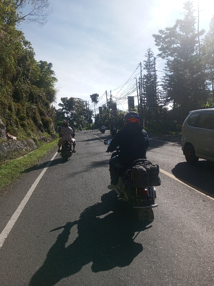 The scene depicts a two-lane paved road, identified as being in Phonethan, Laos, despite a visible license plate "D 5423 EU" on the closest scooter, typically associated with Bandung, Indonesia. The road curves slightly to the left, with a solid white line marking the left shoulder. In the foreground, a person is riding a dark-colored Vespa-style scooter, viewed from behind. The rider wears a dark jacket and a blue and orange helmet. A black soft-sided bag is strapped to the rear rack of the scooter. The scooter casts a long shadow to the left, indicating a low sun angle. Ahead of this scooter, another person is riding an older model scooter, also viewed from behind, wearing a light-colored, patterned shirt and shorts. Further into the midground, additional scooters are visible traveling in the same direction. On the far right side of the road, a light-colored minivan is partially visible, moving concurrently with the scooters. The right side of the road features multiple utility poles strung with numerous power lines, and several vertical rectangular signs are attached to these poles. To the immediate left of the road, a steep embankment is covered in dense green vegetation. The background consists of lush trees and foliage under a bright, slightly hazy sky. The strong sunlight casts prominent shadows.
