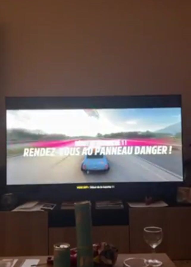 A television displaying a video game is the focal point of the shot. The game, seemingly a racing game, shows a small blue car driving down a road toward a hazard sign. In the foreground is a cluttered coffee table, containing items such as bowls, glasses, remote controls, cans, and other assorted objects. The room's wall is plain and neutral in color. The television is set atop a cabinet. There is no visible human activity.