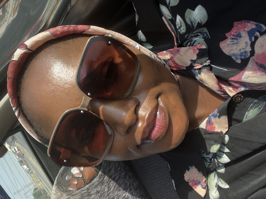 An adult female is depicted from the forehead to mid-chest, seated within a vehicle in Kugbo, Nigeria. She has dark skin, which appears shiny on the forehead and lips, suggesting natural oils or cosmetic application. Her lips are full and slightly parted, coated with a clear or light-colored gloss. She wears large, rectangular sunglasses with brown tinted lenses and light beige frames, featuring two small metallic studs on each frame's outer corners. A light-colored headscarf with a red, beige, and blue floral pattern covers her hair. She is dressed in a dark-colored, likely black, collared button-up shirt adorned with a floral pattern in shades of pink, blue, green, and beige. A single gold-toned, decorative button is visible on the shirt's front. Strong, direct sunlight illuminates her face and upper torso, casting defined highlights. Through the vehicle's rear window, a blurry but discernible street scene unfolds, showing a road with multiple vehicles, including trucks, and what appears to be a barrier or railing under a clear sky.