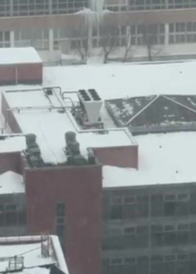 The camera captures a high-angle, static view of a snowy urban scene during a snowfall. The focus is on the rooftops of several buildings, all covered in a blanket of snow. On one of the taller buildings, a large formation of ice hangs precariously from the edge, appearing almost like a frozen waterfall. Various pieces of equipment, such as vents and HVAC units, are visible on the rooftops, partially obscured by the snow. The buildings have multiple windows, reflecting the overcast sky. The snowfall is visible throughout the scene, adding to the wintry atmosphere.