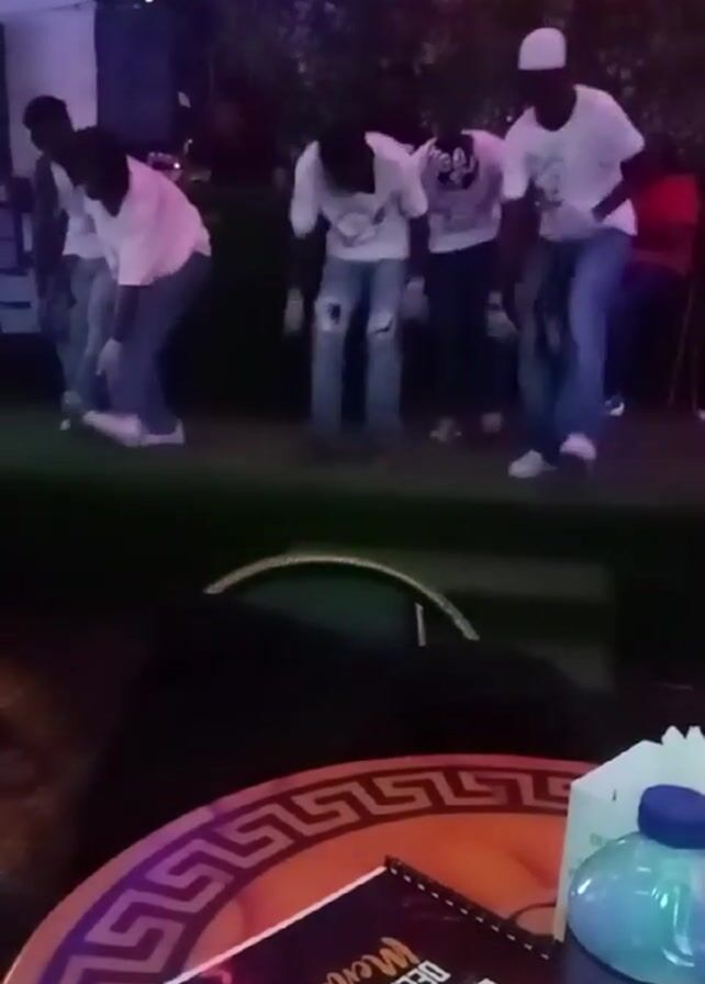 group of six young men dancing on a small elevated platform, likely in an outdoor or semi-outdoor lounge or club environment. The men are casually dressed in white t-shirts and jeans, with some wearing hats. They appear to be performing a synchronized dance, moving in unison to the music. The setting includes a table in the foreground with a menu for "The Kiss Lounge," along with a water bottle. Lighting is a mix of natural and artificial, including some colored lights illuminating the dance platform.
