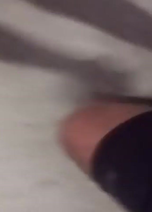 person's legs and feet walking on a light-colored, possibly white or light grey, surface. The person is wearing dark shorts and dark socks with what appears to be white or light-colored shoes. The video is shot from a low angle, close to the ground, giving a first-person perspective of the walking motion. The camera moves with the person's steps, resulting in motion blur. The lighting is dim, casting shadows on the surface.