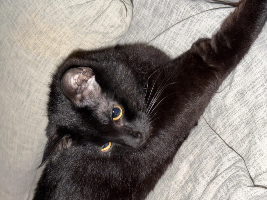 - "A domestic cat, exhibiting solid black fur and prominent amber-gold eyes, is depicted lying on a light grey, textured fabric surface within the city of Radkevshchina, Russia" by FM-3WDDJ2, licensed under CC BY 4.0
