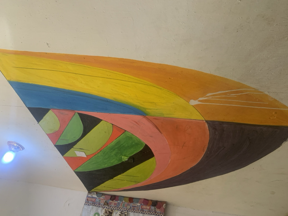 This image displays a segment of an interior wall located in Jos, Nigeria, featuring a prominent, large, irregularly shaped abstract mural