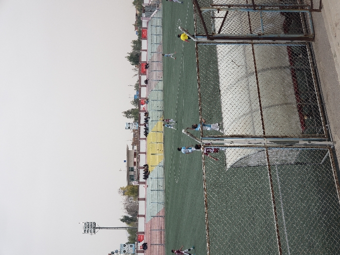 A sports field is visible with a green artificial turf surface. Several individuals in athletic gear are scattered on the field, indicating a game or practice session in progress. A chain-link fence surrounds the field. Bleacher seating lines the side of the field, suggesting a space for spectators. A few buildings are located in the background. The sky above is overcast, providing diffused lighting.