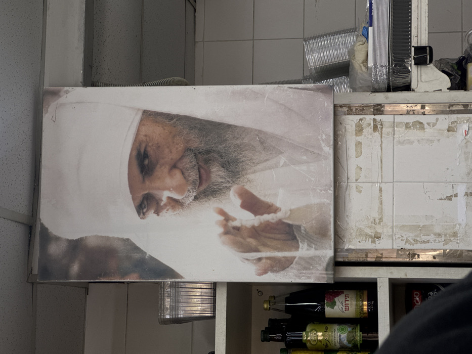 The image displays a vertical framed portrait of an elderly man with a long grey beard, wearing a white head covering and a white garment, smiling faintly and looking downwards to the viewer's right. His right hand is raised, holding a string of white prayer beads. The portrait itself exhibits visible scratches and wear. The portrait is mounted on a wall within an indoor commercial setting, likely a kitchen or storage area. To the left, a white shelving unit is visible, holding various bottles. Prominently featured are a green bottle labeled "שמן זית" (olive oil) and a dark bottle with a red label reading "תירוש" (grape juice/wine), both in Hebrew script. A clear, ridged container sits on a higher shelf. The upper portion of a person's dark-clothed shoulder is visible in the lower-left foreground. To the right of the portrait, a stack of disposable aluminum food trays and white plastic gloves are arranged on a shelf. Below the portrait, the wall features worn white tiles with visible adhesive residue and areas of paint loss. The ceiling above consists of light-colored acoustic tiles. Based on the Hebrew script on the bottle labels, the location is identified as a commercial establishment within the city of Tel-Aviv, Israel.