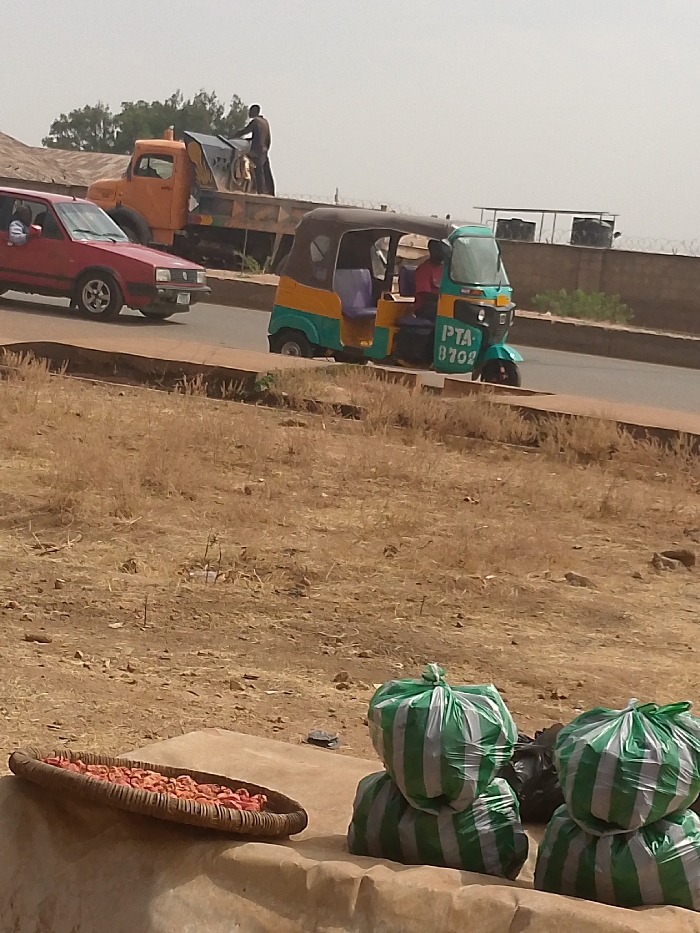 The image portrays an outdoor urban street scene in Jos, Nigeria, under a hazy sky. In the immediate foreground, a dry, brownish-tan landscape with sparse vegetation transitions to a lower concrete or stone surface. On this surface, an oval-shaped woven basket holds numerous small, reddish-orange objects, likely dried produce. Adjacent to the basket, five large bags made of green and white striped plastic are stacked, accompanied by a black plastic bag behind them. The mid-ground features a paved road separated from the foreground by a raised divider. On the road, a red compact car, possibly a Volkswagen Golf Mk2, is positioned on the left with a visible occupant in the driver's seat. To its right, a green and yellow three-wheeled auto-rickshaw (keke-napep), displaying "PTA-0702" on its front, is present. A person in a red shirt is operating the auto-rickshaw, with a passenger also visible inside. Further back on the road, an orange dump truck is observed, with an individual standing on its bed, interacting with a dark object or covering. The background consists of a light, hazy sky. A distant line of green trees is visible on the left. To the right, a light-colored wall topped with barbed wire extends horizontally, behind which indistinct structures are partially visible.