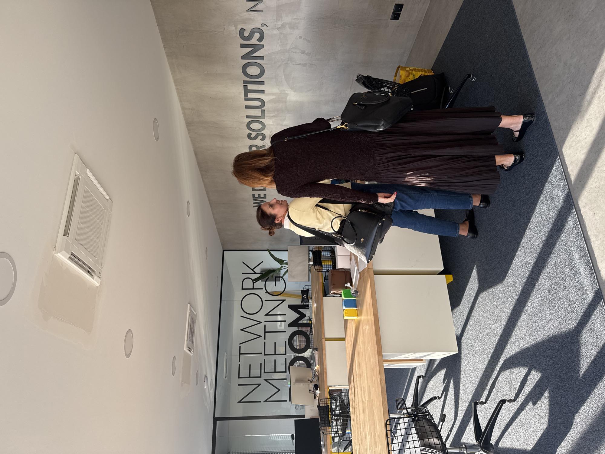 The image depicts an indoor office or co-working space located in Torres Vedras, Portugal, under bright natural lighting. Two adult females are conversing in the foreground, standing on a dark grey speckled carpet. The woman on the left, with brown hair tied back, wears a light yellow long-sleeved top, blue jeans, and black flats, carrying a black shoulder bag with gold hardware. She faces the second woman, appearing engaged in conversation. The woman on the right, seen from behind, has reddish-brown hair and wears a dark brown long-sleeved pleated dress or long skirt with a textured top, and black flats, carrying a black shoulder bag with a chain strap. In the background, a modern office setup is visible. Multiple light wood-colored desks with white and yellow base cabinets are arranged, equipped with computer monitors (some covered in light grey fabric) and black mesh office chairs. On one desk, three colorful square containers (yellow, blue, green) are present. The left wall features a glass partition displaying large black text: "NETWORK MEETING ROOM" and "DOM". The right wall is a textured grey concrete-style surface with large dark grey letters partially spelling "WE DE[LIVER] SOLUTIONS, N[EW]". The white ceiling includes recessed lighting fixtures and two rectangular air conditioning units. Notably, patches of what appears to be water damage or repair are visible on the ceiling around the larger AC unit. Strong shadows from the desks and chairs are cast across the carpet, indicating a significant natural light source. A yellow shopping bag and a black bag/basket are on the floor near the right-hand woman. A strip of lighter grey concrete floor is visible along the far right edge of the frame.