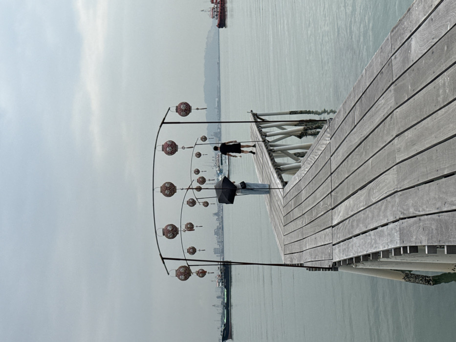 A wooden pier juts out into the water under an overcast sky. A curved metal structure adorned with decorative lanterns frames the scene. Two people are on the pier: one is walking away, dressed in black, and the other is holding a black umbrella. In the distance, a ship is visible, and the shoreline is lined with buildings. The water is calm, and the planks of the pier are weathered gray.