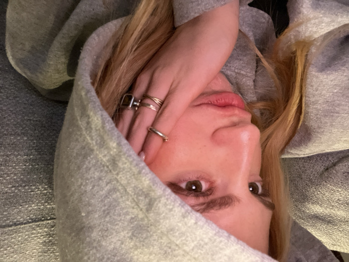 A fair-skinned person wearing a grey hooded sweatshirt with the hood pulled up around their head is the focal point of the image. They are lying down, looking directly at the camera with light brown eyes and blonde hair. Their right hand is near their face, adorned with multiple rings. The background is out of focus. The overall tone is casual and relaxed.