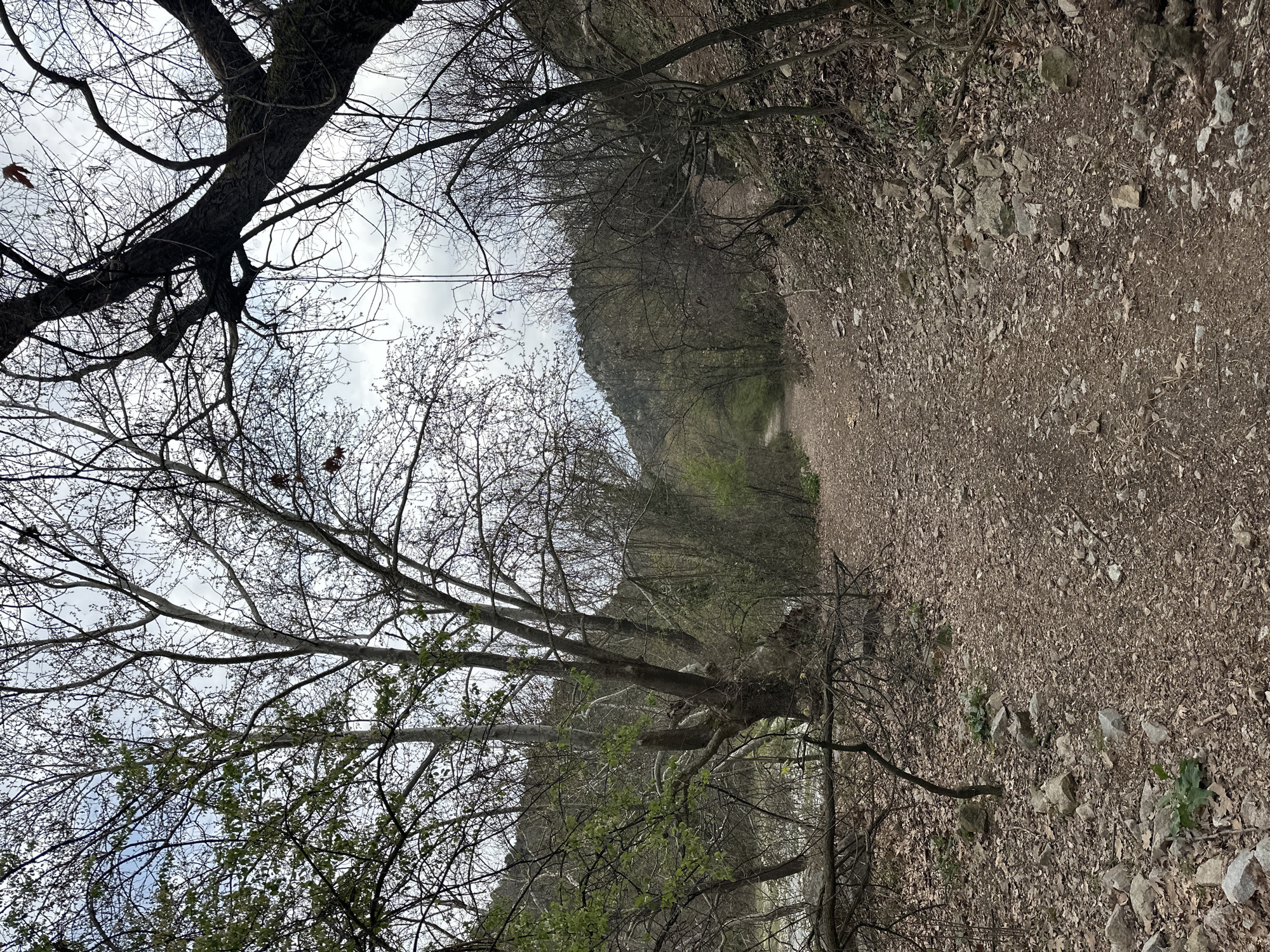 dirt path leading into a forested area near Stara Kresna, Bulgaria. The path is covered with leaves and rocks. Trees with bare branches are visible on both sides of the path, with some new green foliage emerging. A hill or mountain can be seen in the distance at the path's end. The sky is overcast. There are no people visible in the image.