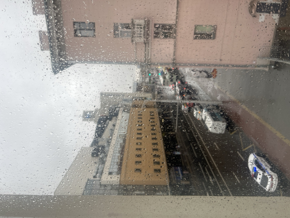 The image displays an urban street scene in Minsk, Belarus, viewed through a rain-splattered window on an overcast day. The visible distortion and numerous water droplets indicate a wet exterior. On the right side of the frame, a multi-story building with a light pink facade is prominent. It features multiple windows with white frames; one window on a middle floor is open or ajar, with a small, white, ornate balcony railing. Another closed window is visible directly below it. Across the street, in the midground, a multi-story building with a dull yellow facade is visible, characterized by a horizontal array of numerous small, dark, rectangular windows on its lower levels. Behind this, a more modern structure with larger windows and a darker upper section is partially discernible. Further in the background, a light-colored building with a distinct, small tower or spire rises against the grey sky. The street below is a wet, multi-lane asphalt road. In the lower-left foreground, a white police sedan with blue emergency lights on its roof is parked or slowly moving in a reddish-brown dedicated lane. A white public transport vehicle, likely a bus or trolleybus, follows further ahead in an adjacent lane. Multiple vehicles are queued in the distance, displaying red taillights, indicating traffic congestion. A green traffic light is visible in the distance, suggesting an active intersection. The general environment indicates an active city street during inclement weather. This scene is consistent with a view of **Niezaležnasci Avenue (Independence Avenue) in Minsk, Belarus, likely from a building near the intersection with Lenin Street, looking northeast along the avenue.**