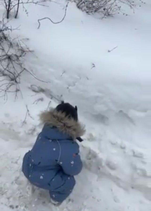 toddler wearing a blue snowsuit and a knit cap with cat ears. The toddler is walking through a snowy area. The snow is deep in some places, covering small bushes. The toddler appears to be exploring and navigating the snowy terrain. The weather seems cold, as evidenced by the snow.