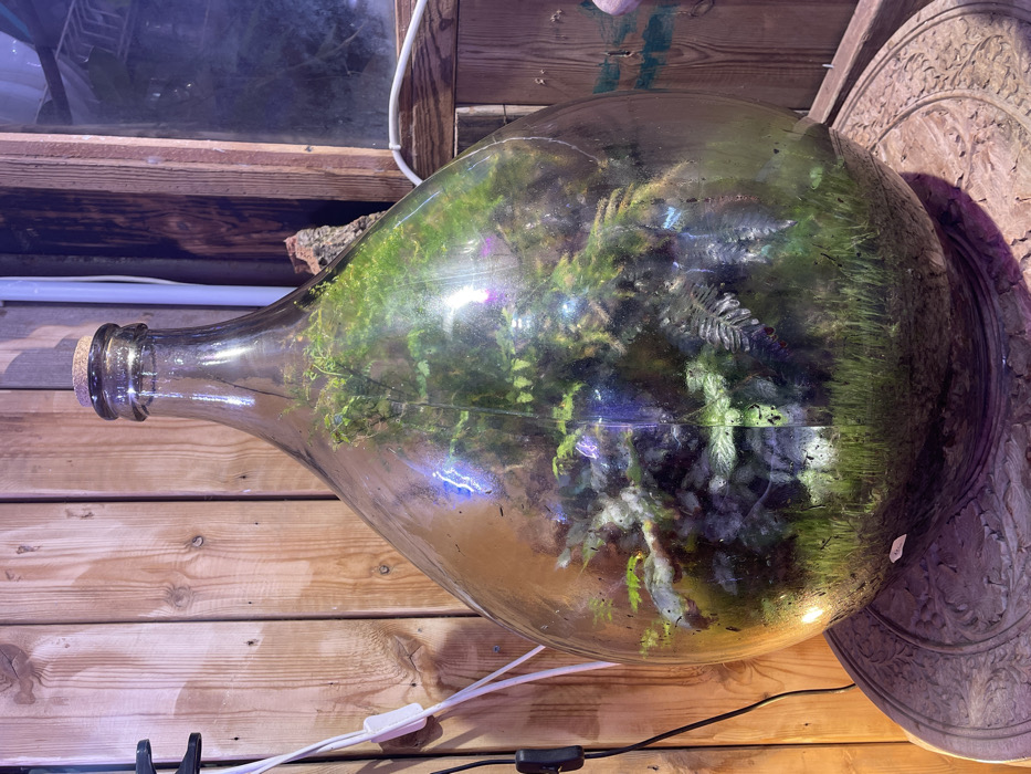 - "A large, clear glass terrarium, shaped like an inverted teardrop or demijohn, occupies the central focus of an indoor scene" by FM-lYn4w2, licensed under CC BY 4.0