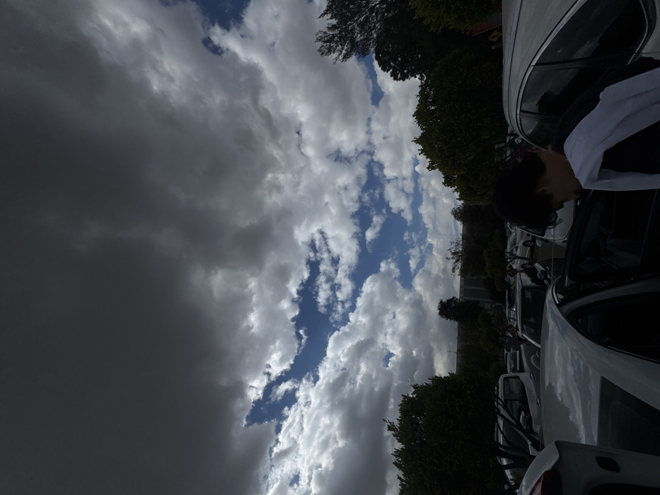 The photograph captures a parking lot with a row of white cars angled toward the foreground. A person is visible near a car's open door. Above the vehicles and greenery, the sky is a dramatic canvas of clouds. Dark, ominous storm clouds dominate the left side, contrasting with patches of blue sky interspersed with white, fluffy clouds on the right. The transition between the stormy and clear skies creates a dynamic and visually striking atmospheric scene.