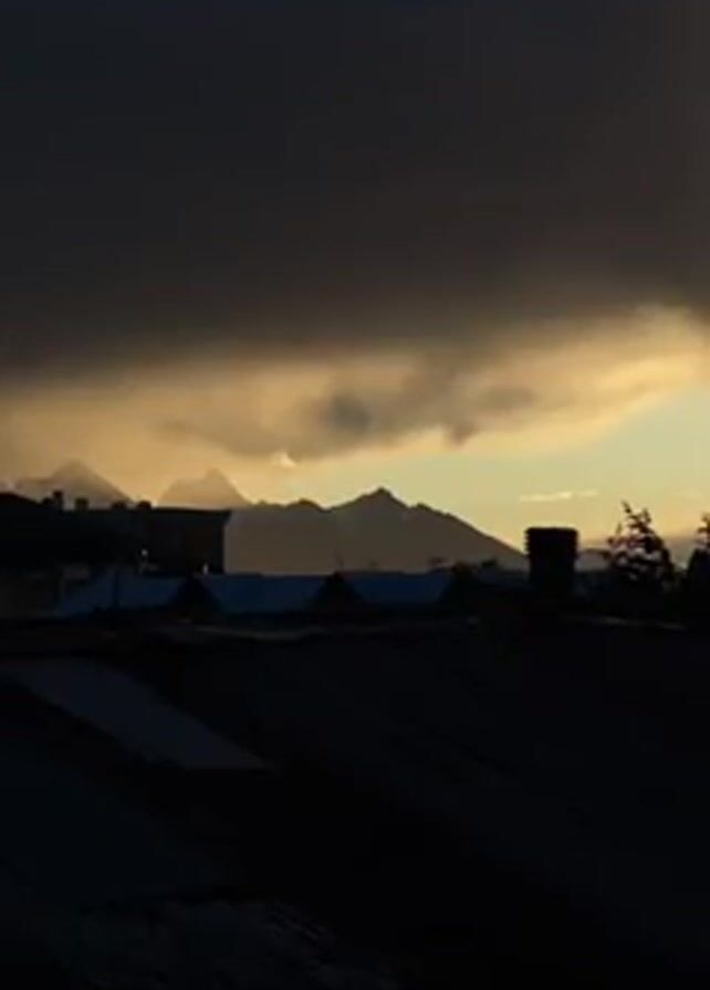 view from a roof overlooking other buildings and mountains in the distance. The scene is dark, with a large, dark cloud formation dominating the sky. A golden hue is visible where the clouds are thinner, suggesting the sun is setting or rising. The outlines of the mountains are visible against the lighter sky. The roofs in the foreground are silhouetted and appear to be made of corrugated metal. A few trees are visible on the right side of the frame.