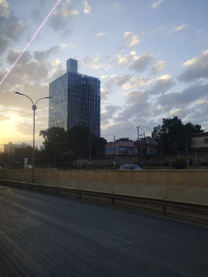 A modern skyscraper stands against a cloudy sunset sky. A street lamp is visible on the left, lining the edge of a roadway. Across a low wall, trees partially obscure a residential area with multi-colored buildings. A vehicle is parked along the road behind the wall.