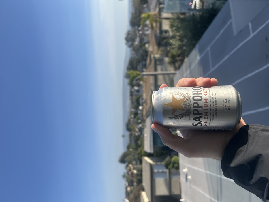 - "A light-skinned hand, partially obscured by a dark jacket sleeve on the left, holds a cold, condensation-covered silver Sapporo Premium Beer can in the foreground" by FM-a1eA33, licensed under CC BY 4.0