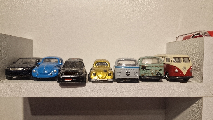 An interior scene depicts a collection of eight miniature toy vehicles displayed in a single row on a light-colored, textured shelf. The background consists of a plain, light-colored wall. The scene is located in Dobrich, Bulgaria; however, the precise location within the city is indeterminable from the visual evidence. From left to right, the objects are: a dark-colored sedan, a blue Volkswagen Beetle, a black sedan with a red lower bumper accent, a gold Volkswagen Beetle featuring a red symbol on its hood, a light gray Volkswagen T1/T2 van with a blue stripe along its roofline, a teal Volkswagen T1/T2 van exhibiting simulated wear and rust effects, and a red and cream Volkswagen T1/T2 van. All vehicles are positioned facing forward. In the upper right quadrant of the image, above the shelf, a portion of a red and white toy object is partially visible. No individuals are present in the image. The static arrangement of the objects indicates a display.