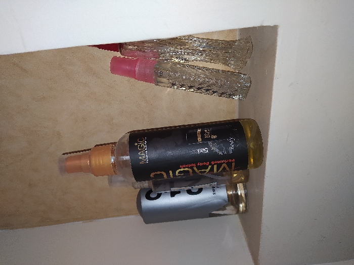 The image depicts five personal fragrance bottles arranged on a white shelf within an interior space. The rear wall is light beige with a subtle texture, while a white vertical partition borders the right side of the shelf. From left to right: a cylindrical bottle with a silver-colored upper section and a clear glass base containing a light yellow liquid, partially obscuring a smaller, clear glass bottle with a transparent spray top; a central opaque black spray bottle with a gold-colored sprayer, labeled "MAGIC Perfumes Body Splash" and "Body," containing a clear yellowish liquid; and two slender, clear glass bottles with faceted or ridged textures and pink spray tops, containing clear liquid. The leftmost bottle displays partial text "SWE". The precise location within the city of Harasta, Syria, is not discernible from the visual content of the image.