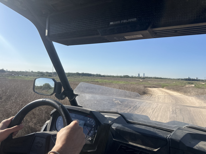 The image depicts a first-person view from inside a Polaris Utility Terrain Vehicle (UTV), observed from the driver's perspective. Two hands are visible on the black steering wheel, positioned at approximately the 9 and 3 o'clock positions, indicating a driver is operating the vehicle. A light-colored bracelet is worn on the right wrist. Above the windshield, an overhead console labeled "MS QUATTRO POLARIS" is visible. A digital instrument cluster is partially visible below the windshield. The UTV is traveling on a dusty, unpaved dirt track, which shows visible tire impressions and extends into the distance. The immediate environment consists of extensive fields of dry, brown, and sparse green vegetation, consistent with scrubland or undeveloped land. To the left, a side mirror reflects a small section of vegetation. The sky above is clear and blue, with a prominent sunflare in the upper left quadrant. In the far distance, a cluster of high-rise buildings forms a discernible city skyline on the horizon. This terrain and distant urban panorama place the scene in the vicinity of Kfar Shmaryahu, Israel.