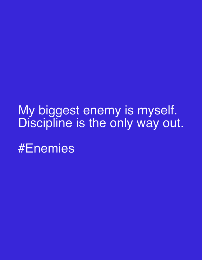 The image displays white text rendered on a solid royal blue background. The text reads: "My biggest enemy is myself. Discipline is the only way out. #Enemies". There are no discernible visual elements depicting people, subjects, objects, actions, interactions, or a specific environment. The image provides no information regarding a physical location, including the city of Marousi, Greece.