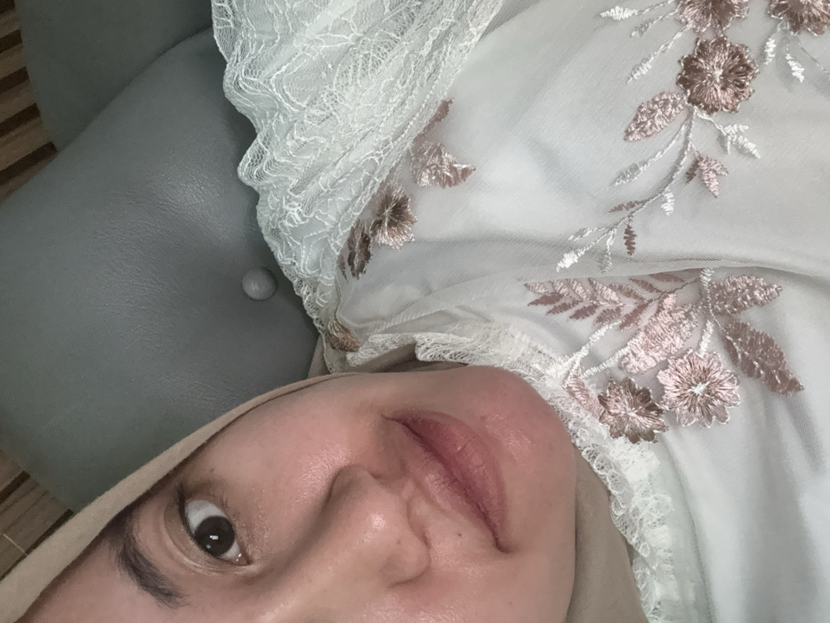 An indoor, close-up photograph taken in Gadingrejo, Indonesia, depicts the upper-left quadrant of a female subject's head and torso