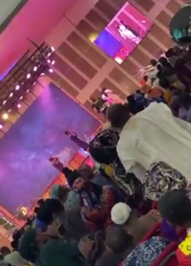 large crowd of people in a brightly lit indoor space. A stage with a large screen displaying a galactic image is visible at the front. There's another screen higher up showing what seems to be a person. The crowd appears to be engaged in some form of celebration, with some raising their hands. The camera moves around, showing different sections of the crowd and the overhead lighting. The video is slightly tilted.