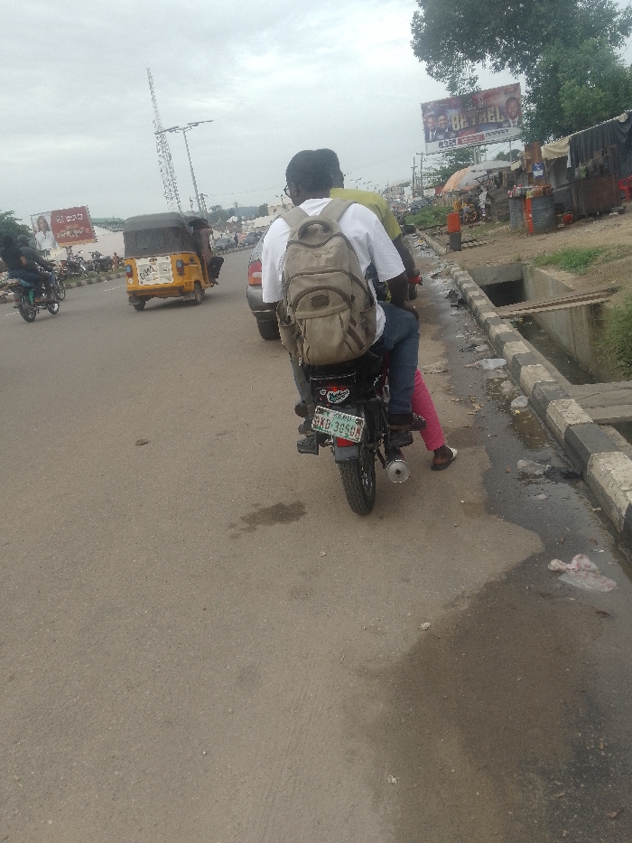 The image presents a forensic view of an urban street in Lokoja, Kogi State, Nigeria, under an overcast sky. The primary subject is a black motorcycle, viewed from directly behind, carrying two individuals. The rear passenger, in the immediate foreground, wears a white short-sleeved shirt, blue jeans, and a light brown backpack. The driver, partially visible, wears a light yellow-green shirt and pink trousers, with a white slip-on sandal visible on the left foot. The motorcycle displays a green Nigerian license plate, "KOGI DAD 395UN." The asphalt road surface shows minor wear and a small, dark fluid stain in the left foreground. To the right, a concrete curb, striped in grey and black, borders an open concrete drainage gutter containing stagnant water and scattered debris, including a plastic bag. Beyond the gutter, a roadside market is established, consisting of multiple makeshift stalls constructed from tarpaulins and various materials. Indistinct figures are visible interacting within this market area, situated beneath the foliage of a large tree. In the mid-ground, vehicular traffic includes a yellow "Keke Napep" tricycle with "RIMA" visible on its side, followed by a light-colored sedan. Another motorcycle is visible further left in motion. The background features two prominent billboards: one on the right displaying "BETHEL" with multiple faces, and another on the left featuring a woman's portrait. A tall, lattice-style metal structure, consistent with a street light or communication tower, is visible on the left side of the road in the distance. The scene depicts active transit and commerce within a Nigerian city environment.