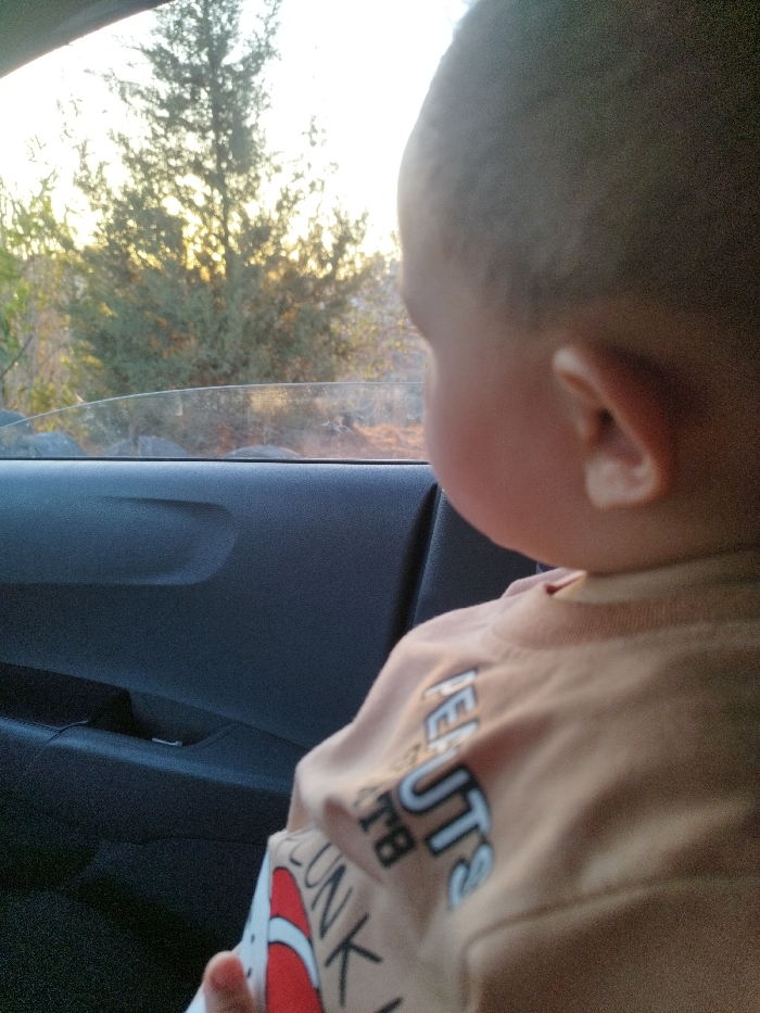 This image, set in al Burj, Palestinian Territory, depicts a young child seated inside a vehicle, viewed from the rear right