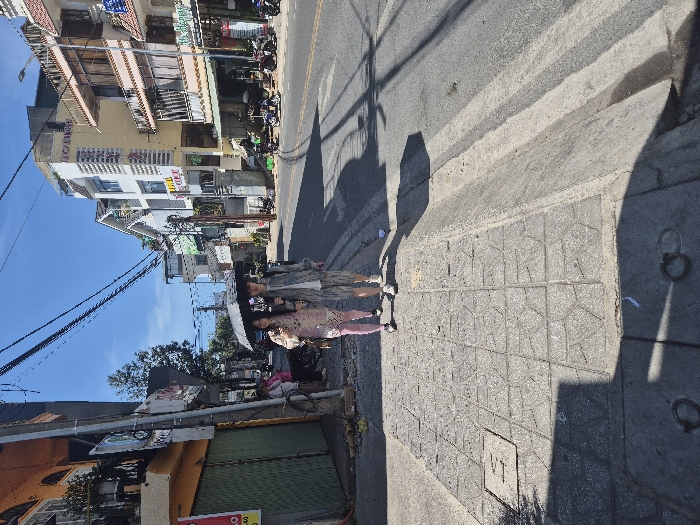 Two women walk on a sidewalk under an umbrella. Buildings line the street, with power lines visible in the blue sky. A shadow of an object is visible on the road adjacent to the sidewalk. A storefront is visible, and the street scene is bright and sunny.